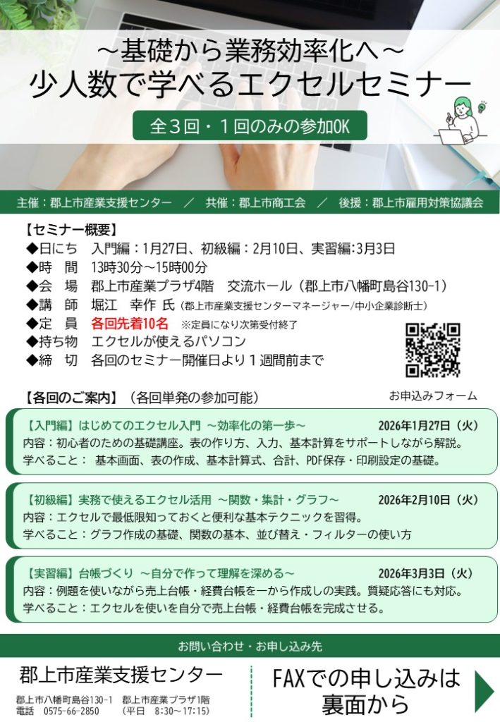 Excelを使った業務効率化を目指し、基礎から実務に役立つ内容までを段階的に学べる「エクセルセミナー(全3回)」を開催します。